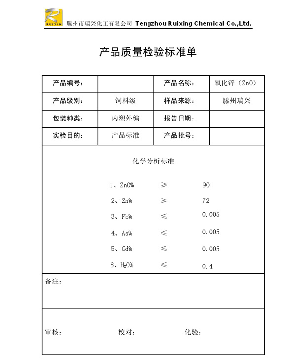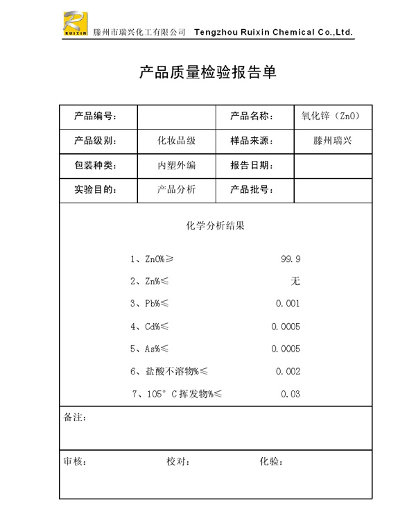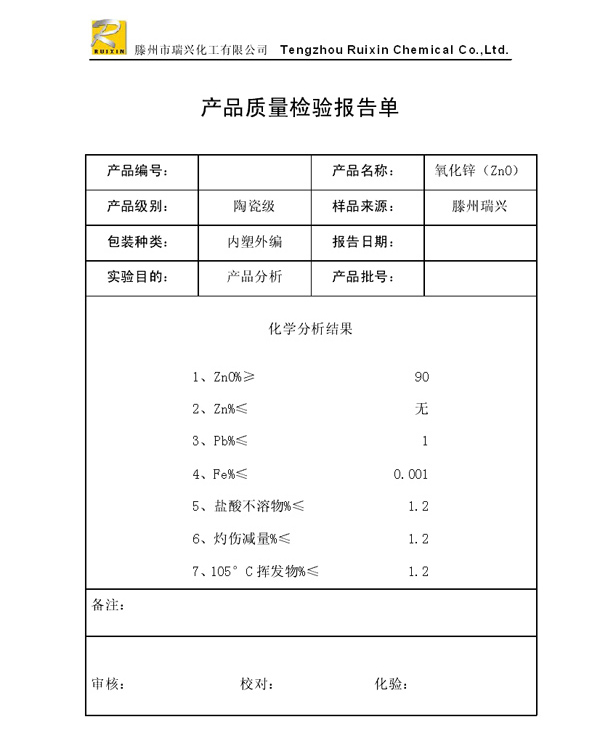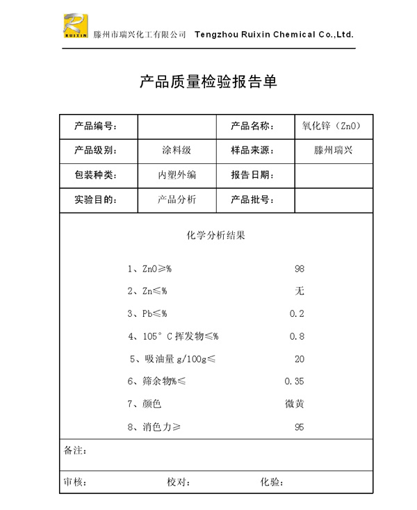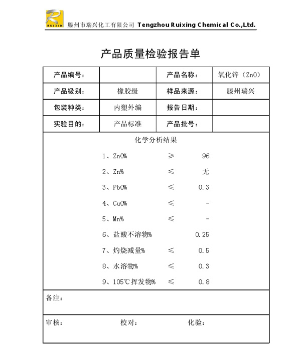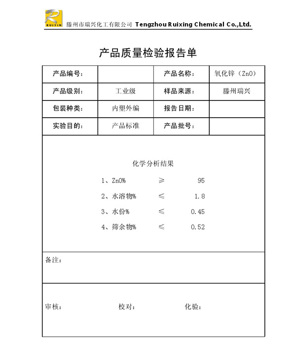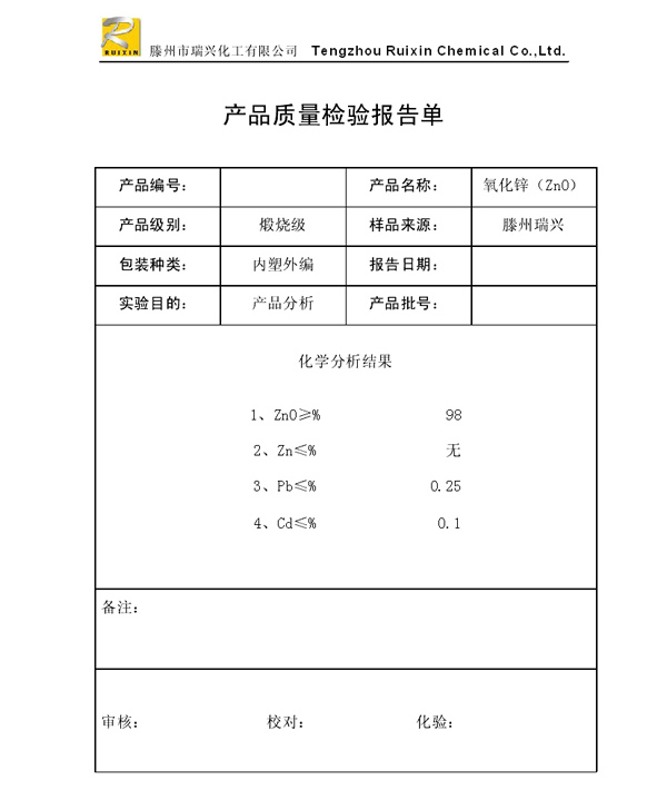 瑞興化工有限公司是生產氧化鋅的重點企業,于2008年通過ISO9001:2008質量管理體系認證。“瑞興”牌氧化鋅在國內擁有較大穩(wěn)定的市場,并遠銷東南亞、中東、中南美等國家和地區,在國內外享有較高聲譽。
